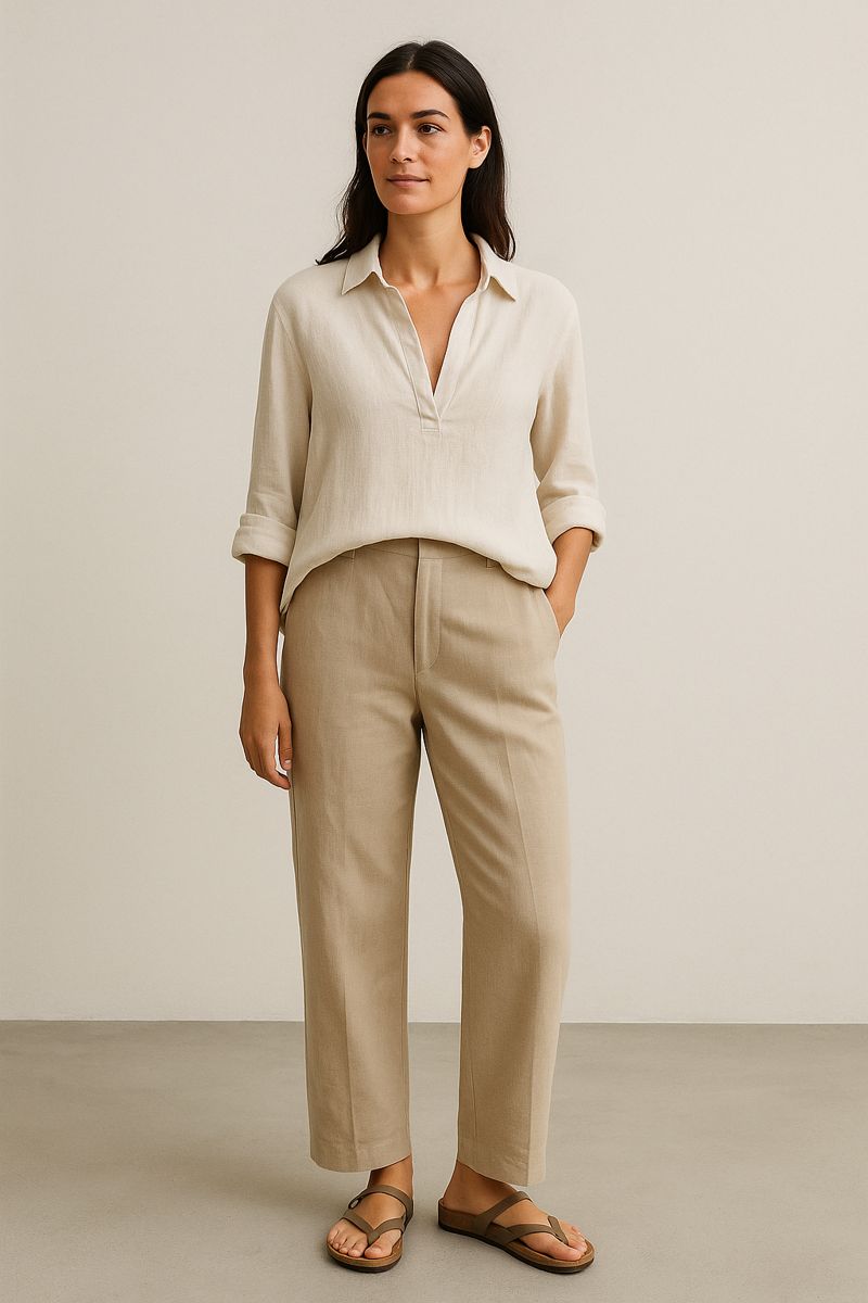 Linen trousers combined with an open-neck cotton shirt and Birkenstock Mayari or Gizeh sandals channel effortless Mediterranean energy.