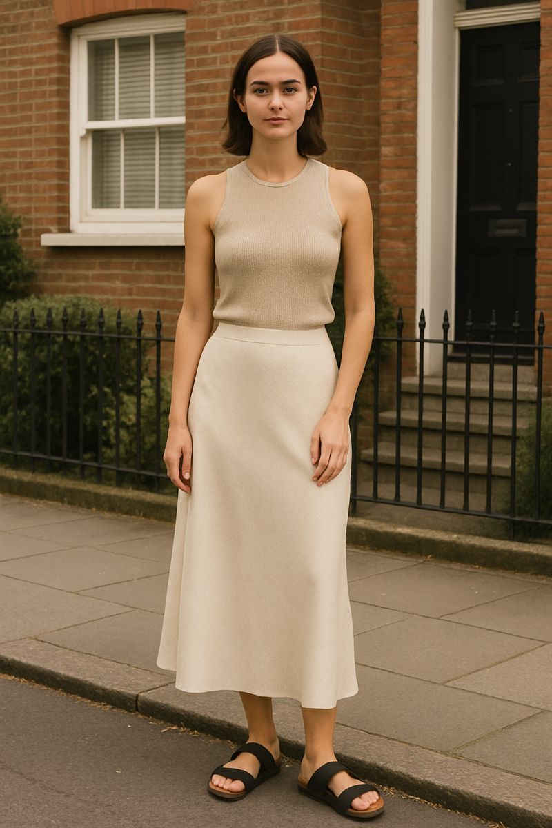 A bias-cut midi skirt paired with a sleeveless knit and Birkenstock Madrid slides creates beautiful contrast between fluid fabric and matte sandal.