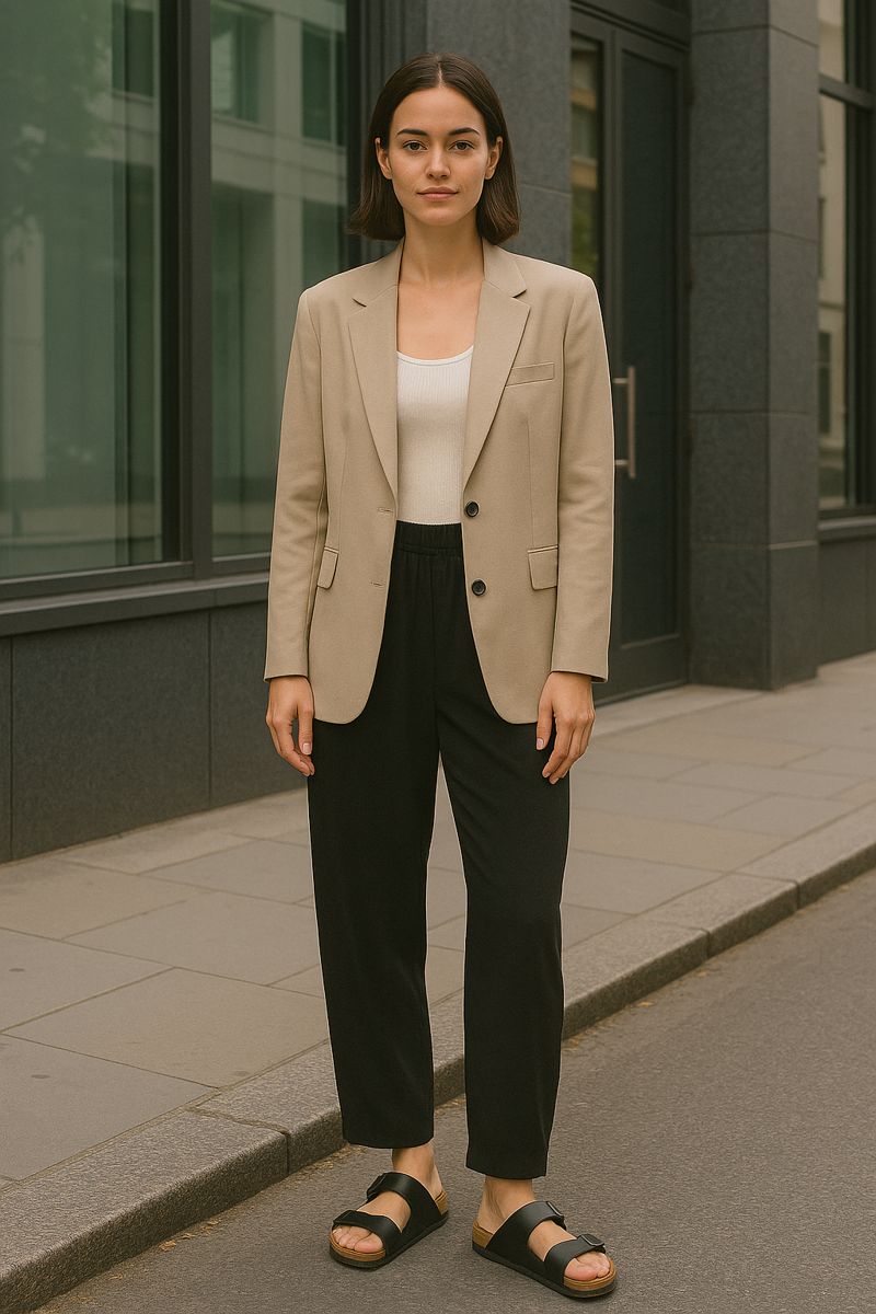 Relaxed blazers layered over tanks and paired with elastic-waist trousers plus Birkenstocks redefine business-casual for the modern era.