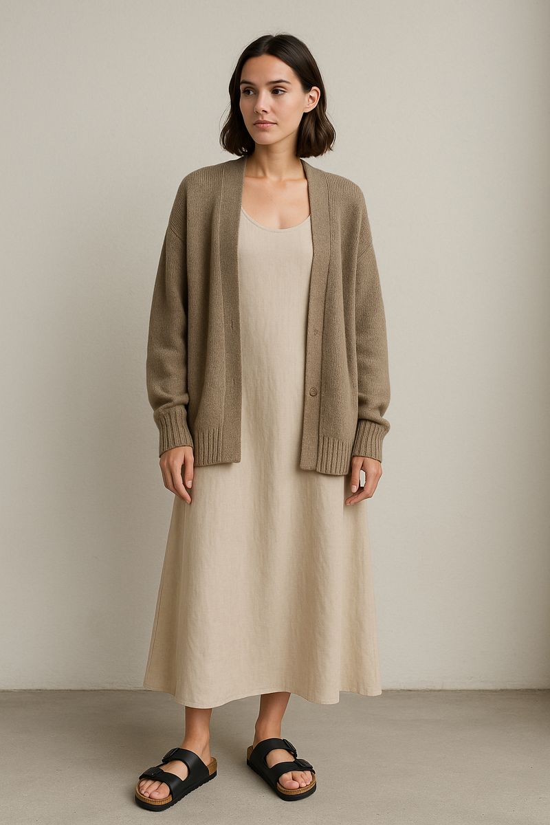 Midi dresses paired with oversized cardigans and Birkenstock Arizonas represent comfort dressed up rather than dressed down.