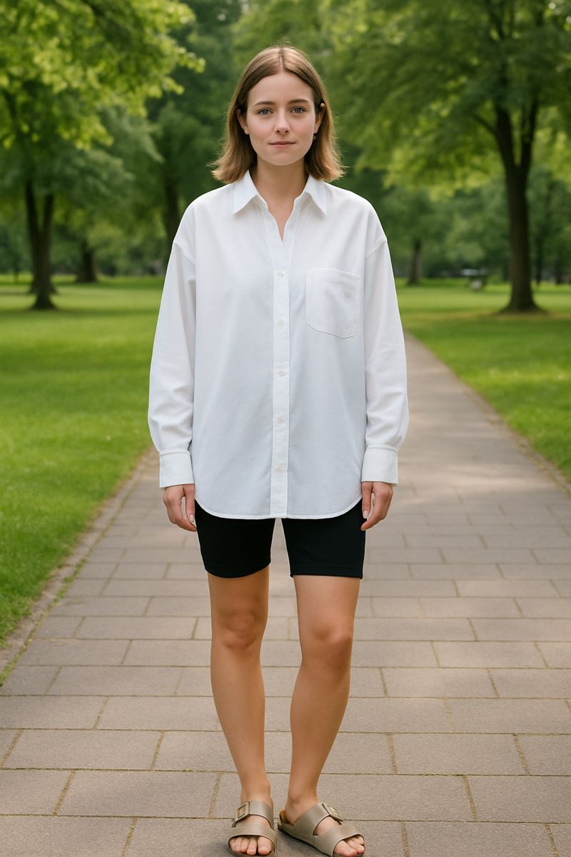 An oversized cotton shirt worn as outerwear over bike shorts or straight pants with Birkenstocks creates one of 2026’s easiest silhouettes.