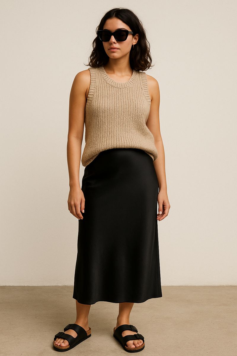 Satin or silk skirts combined with chunky knit tanks and Birkenstocks showcase 2026’s major rule: texture over print.