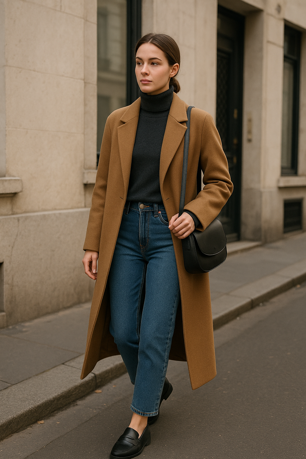 1. Long Wool Coat + Turtleneck + Straight-Leg Jeans