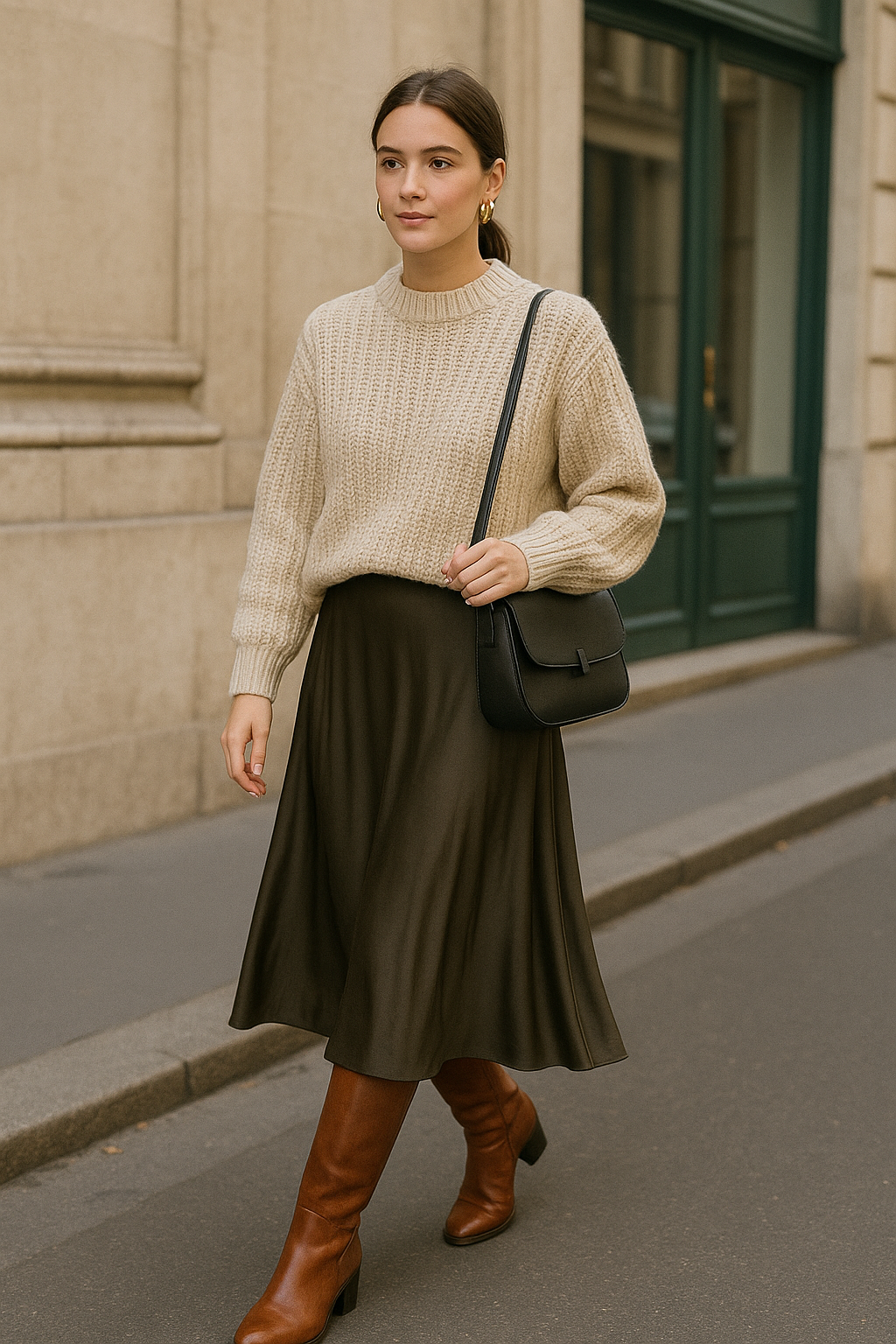 Mixing textures is the secret to making this combination feel special. A chunky knit sweater balances beautifully against the smooth drape of a satin or pleated skirt.