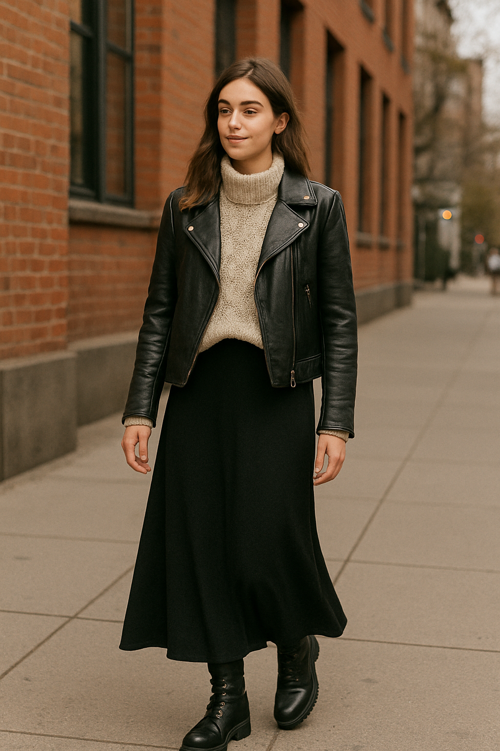 A slightly worn-in leather jacket adds edge and balances the softness of the skirt. Combat or biker boots ground the look and keep it practical for weekend adventures.