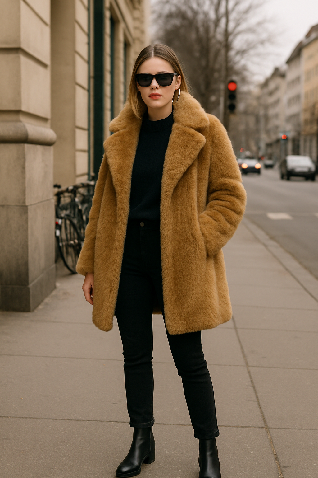 An all-black base creates the perfect canvas for a statement faux-fur or teddy coat. The contrast between the sleek black layers and the plush texture of the coat feels luxurious and intentional.