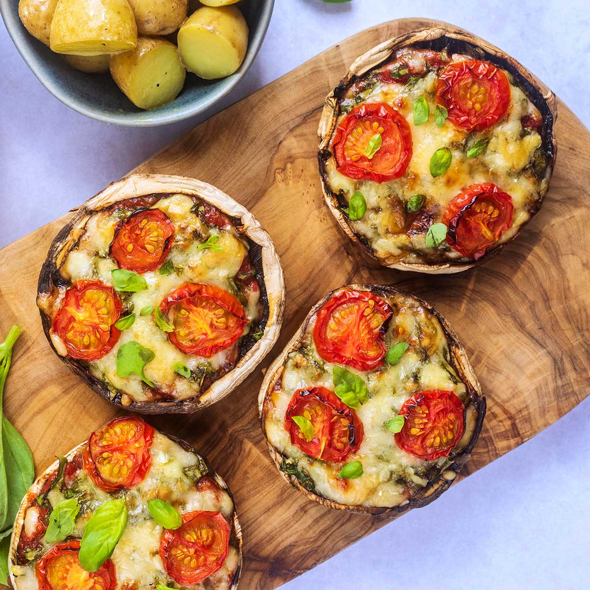 Remove stems and gills from portobellos, then roast briefly to remove excess moisture. Top with a thin layer of marinara, reduced-fat mozzarella, and pile on vegetables. A sprinkle of Italian herbs and a drizzle of olive oil finish these personal pizzas.