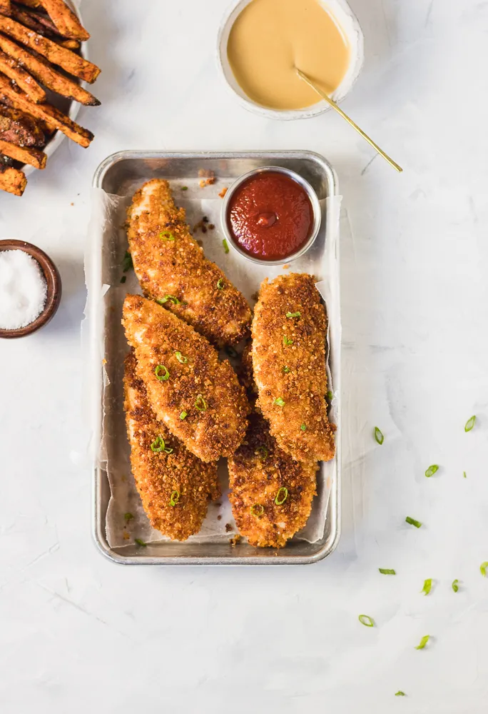 Crispy on the outside, juicy on the inside – these chicken tenders deliver all the crunch without the fryer! The secret weapon is cooked quinoa mixed with breadcrumbs for an extra protein boost and incredible texture. Kids and adults alike can’t resist these finger-licking good tenders.