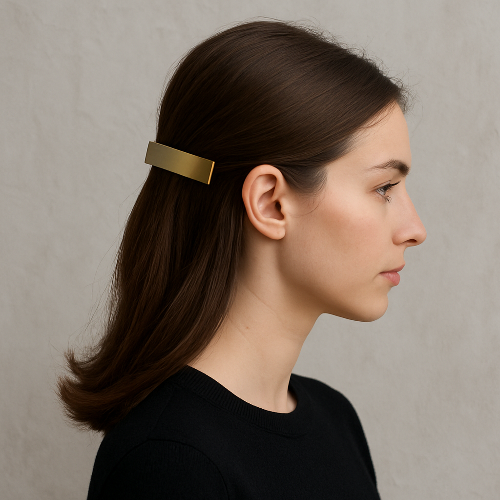 A slim rectangular barrette in brushed gold can transform a simple half-up style into something boardroom-ready. The clasp mechanism stays hidden while the sleek top surface becomes a subtle statement piece. Look for designs without excessive embellishment or cutesy shapes.