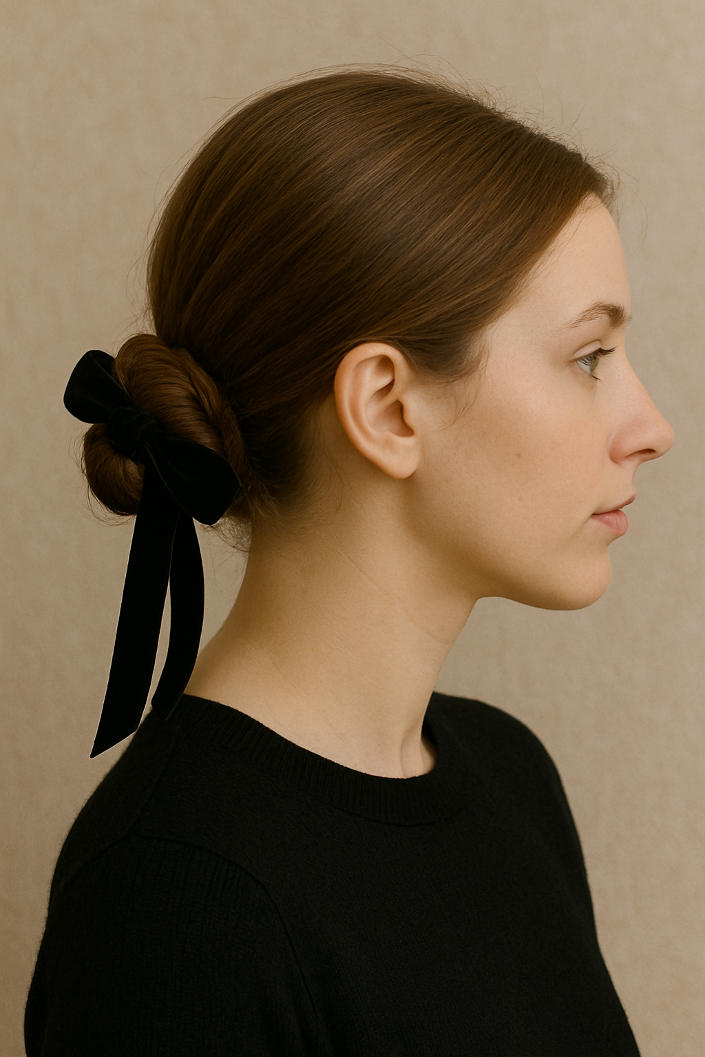 Tie a slim black velvet ribbon around the base of a low bun or weave it through a three-strand braid for texture and visual interest. The key is choosing narrow widths and rich, deep colors rather than bright primary shades.