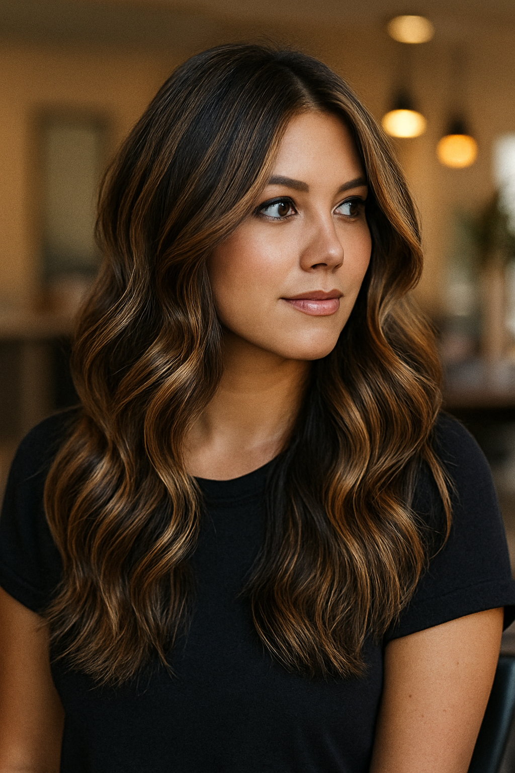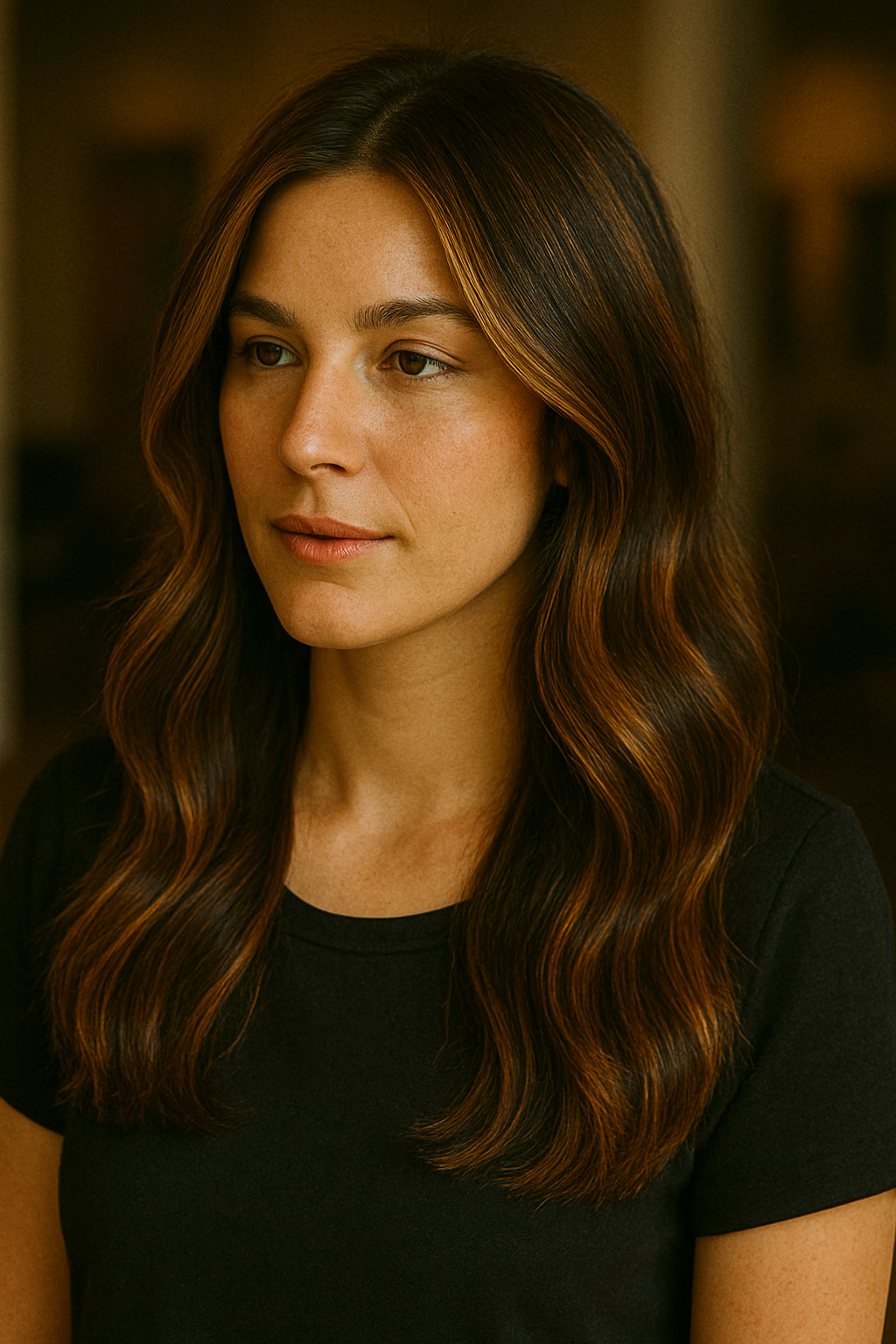 It’s particularly flattering on warm skin tones and brings incredible life to brown hair without requiring bleach to platinum levels. The result is sophisticated depth that grows out beautifully and maintains its richness between appointments.