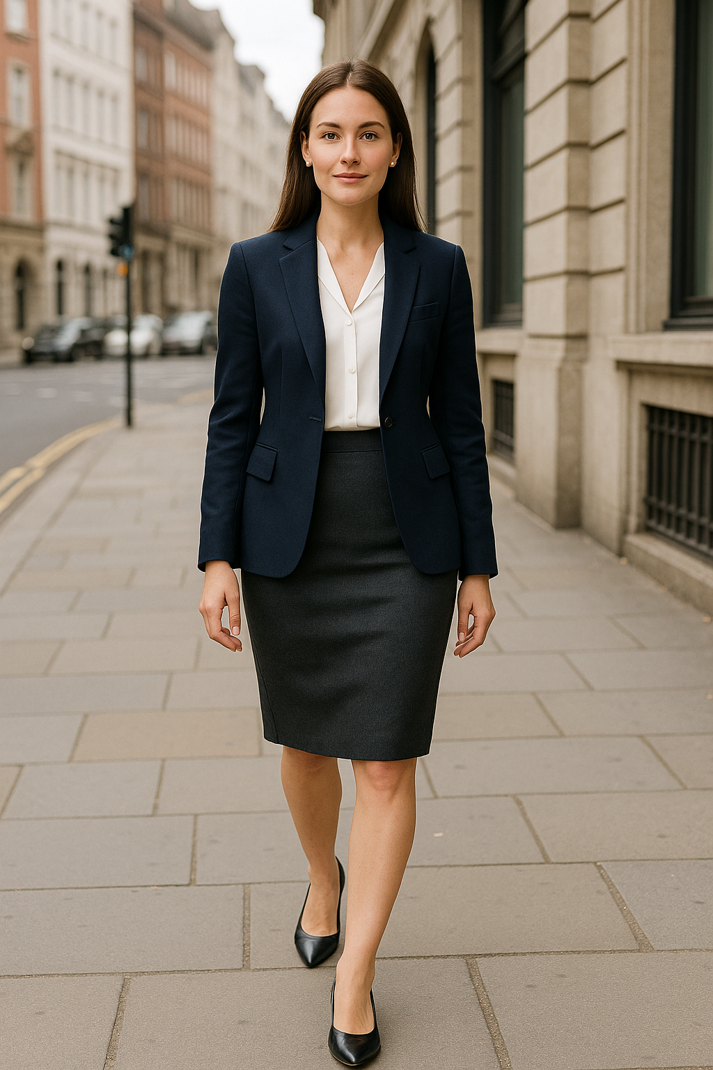 1. Tailored Navy Blazer + White Silk Blouse + Charcoal Pencil Skirt
