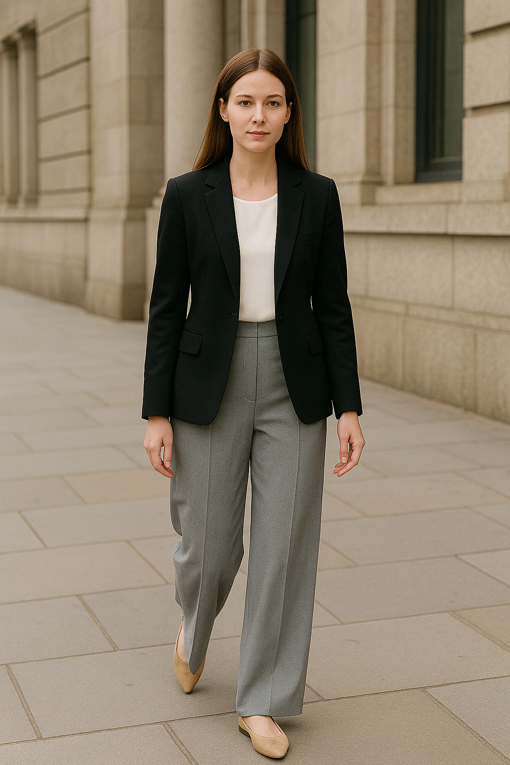 When paired with a sharp black blazer, light grey trousers create a sophisticated contrast that feels current and confident. The neutral pointed-toe flats keep things grounded and practical, proving you don’t need heels to look executive.