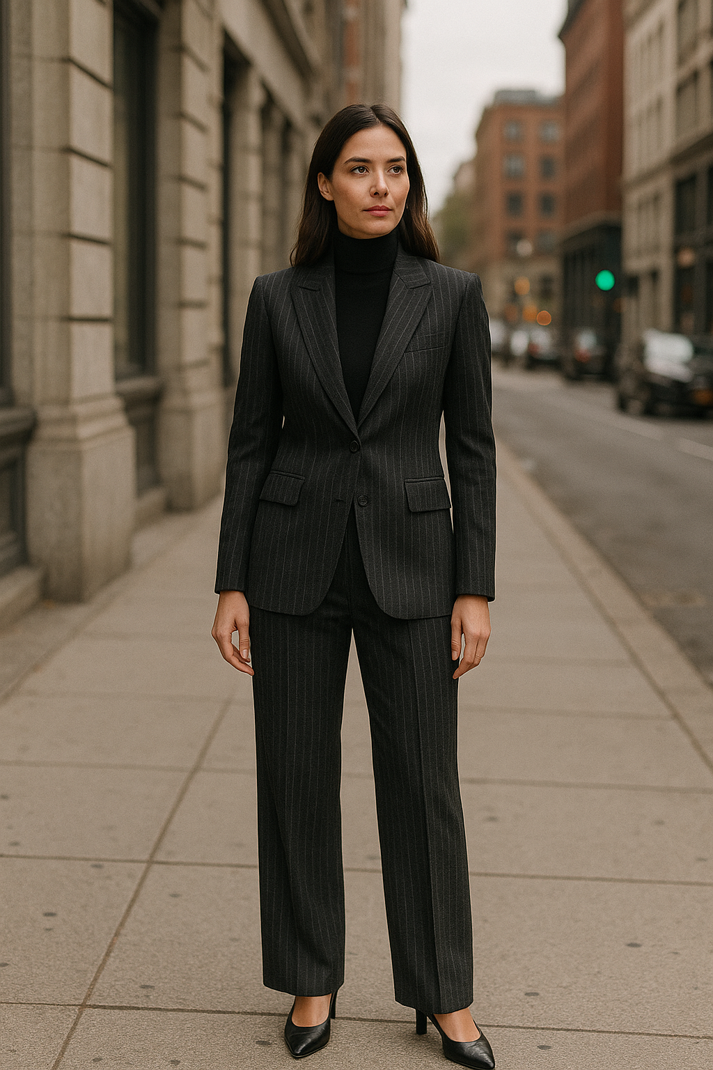 Pinstripes have long been associated with power dressing, but when done right, they feel modern rather than dated. A charcoal pinstripe pantsuit brings subtle texture and visual interest to your professional wardrobe.