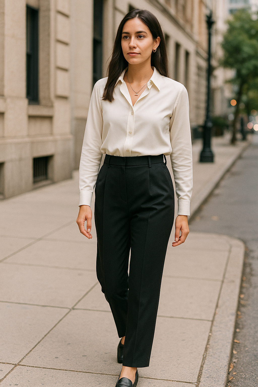 5. Ivory Button-Down Shirt + Black High-Waist Trousers + Minimal Gold Necklace