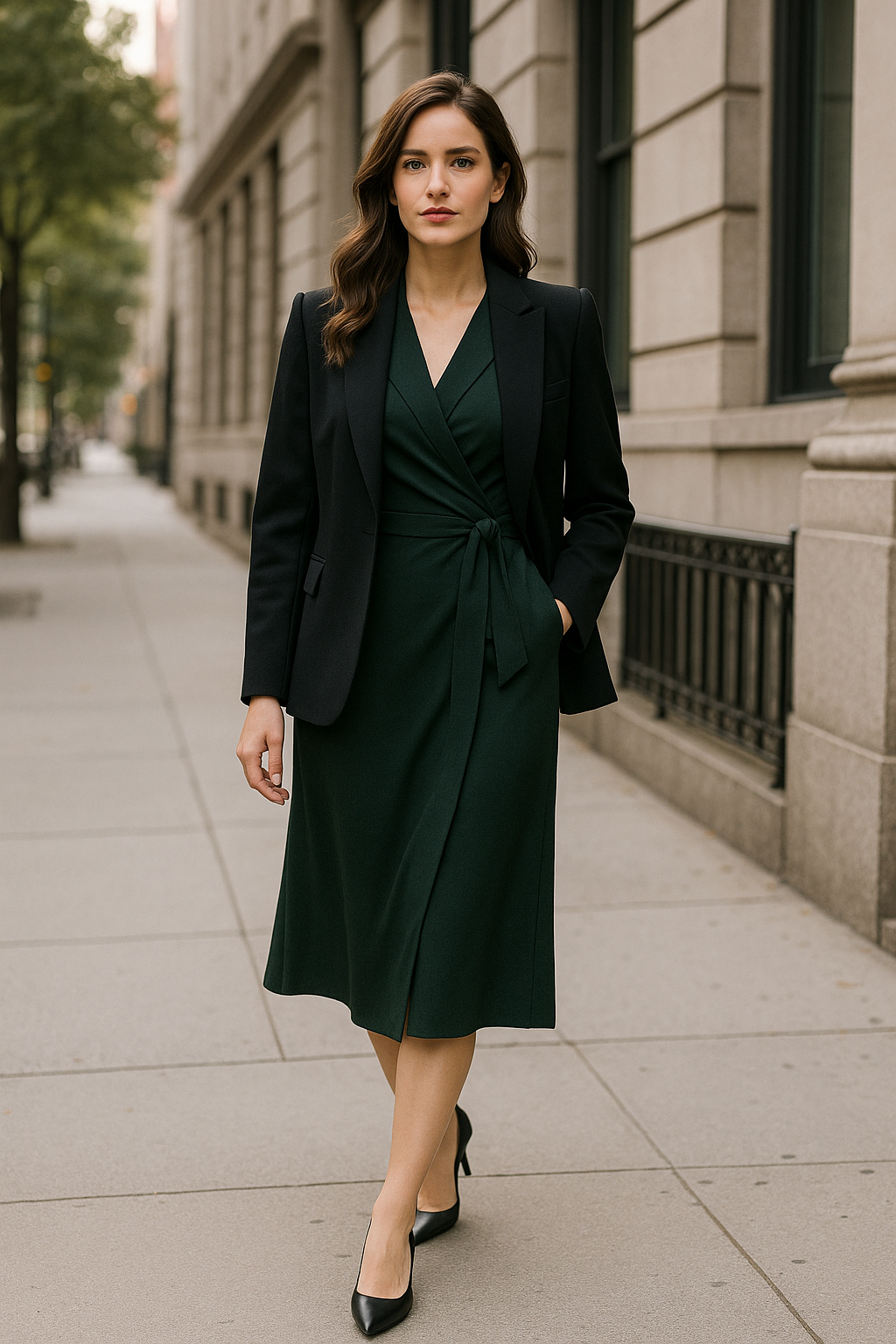 6. Dark Green Midi Wrap Dress + Black Blazer Draped Over Shoulders + Simple Heels