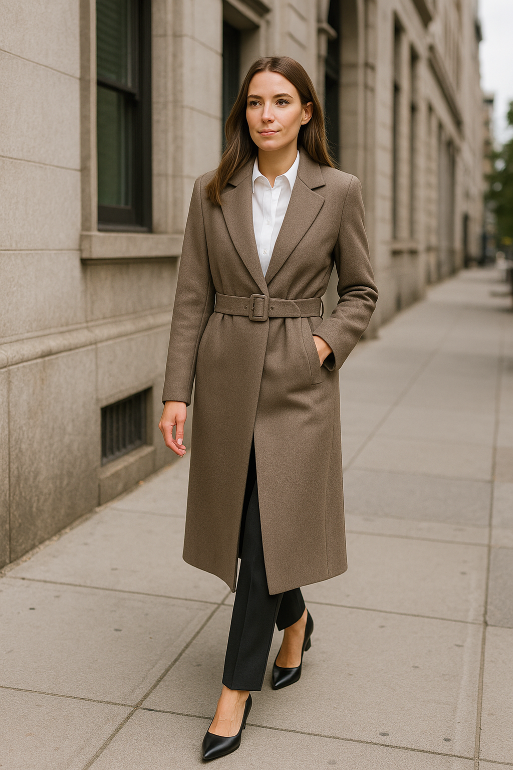 A longline coat is the ultimate power piece for cooler weather. When belted at the waist, it creates a commanding silhouette that exudes executive presence from the moment you walk through the door.