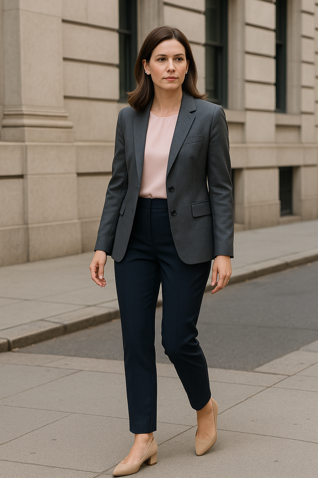 10. Steel-Grey Blazer + Soft Blush Blouse + Navy Tapered Trousers