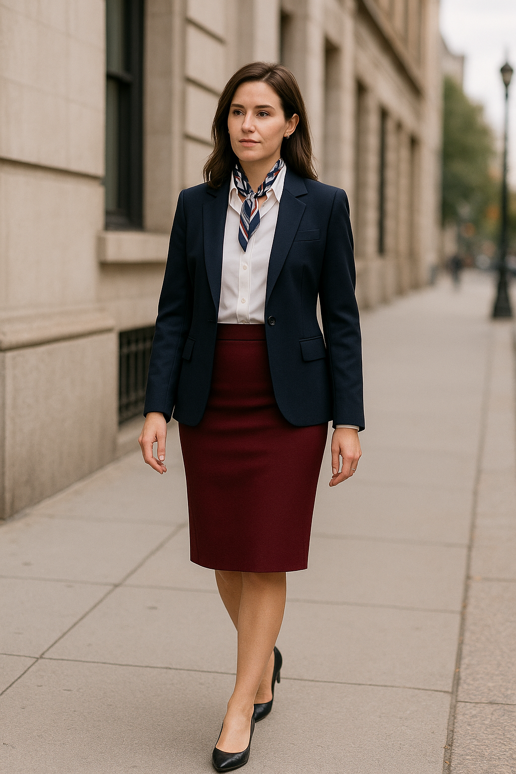 Adding a burgundy pencil skirt introduces rich color that feels both confident and sophisticated. The navy blazer ties everything together while the subtle patterned silk scarf adds a finishing touch that elevates the entire look.