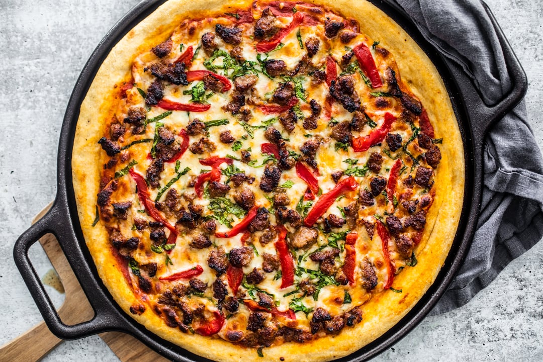 Bold Italian sausage brings heat and fennel-spiced flavor that pairs perfectly with sweet roasted peppers. Breaking the sausage into chunks rather than slices creates satisfying bites of seasoned meat throughout your pizza.