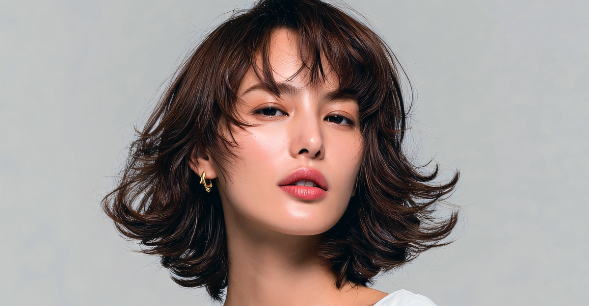 Combined with glossy mid-length hair, this style balances youthful energy with sophisticated polish.