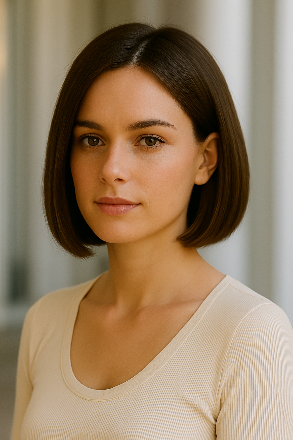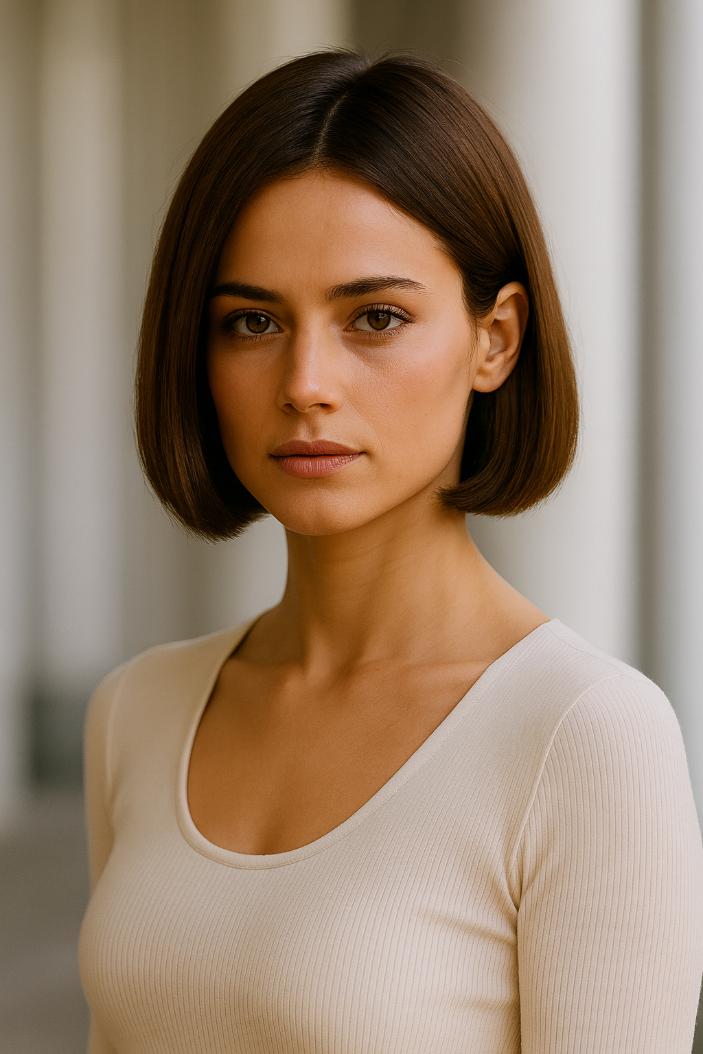 This evolved version of the classic bob sits higher on the neck with sharper angles and more refined proportions.