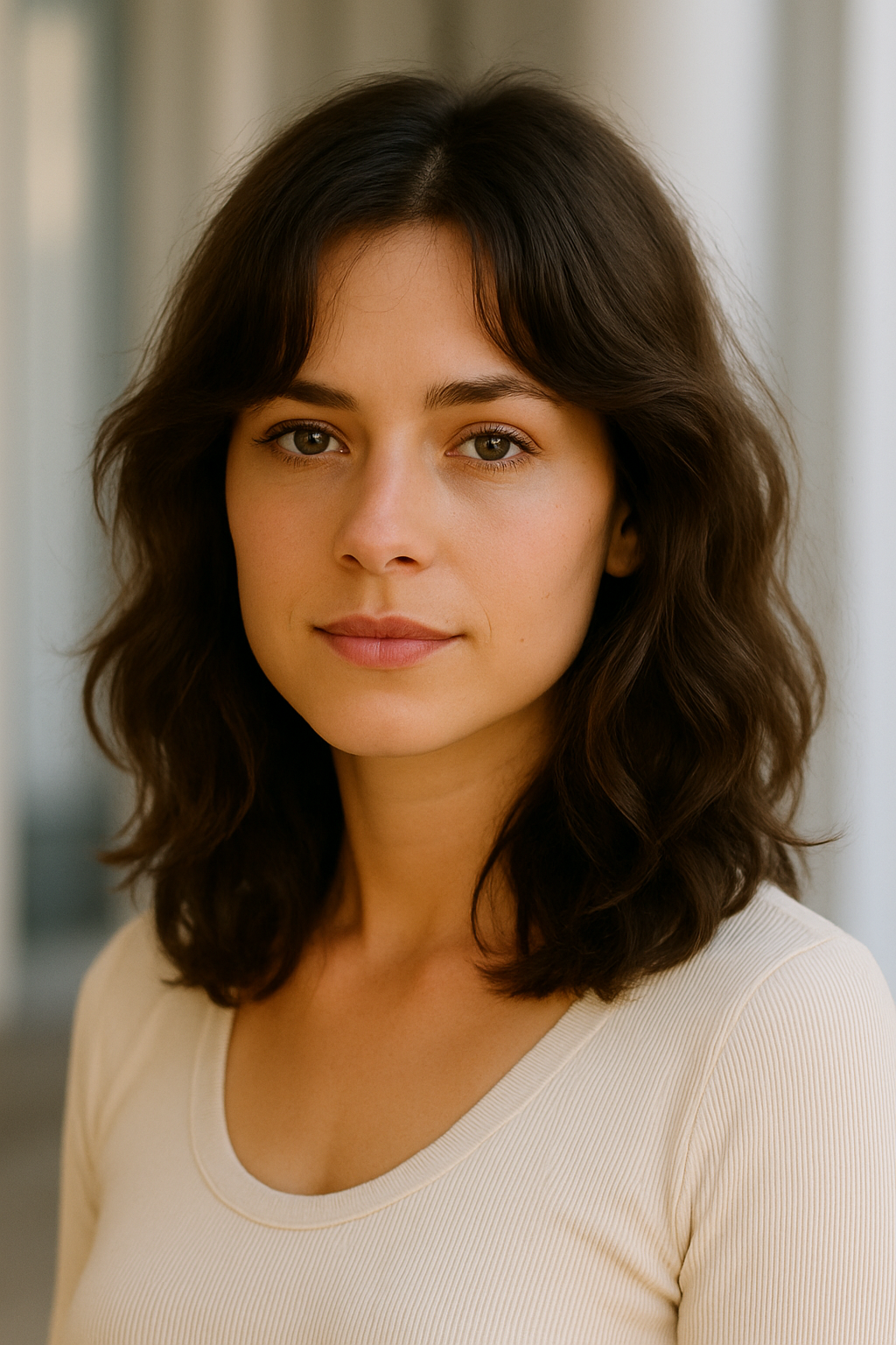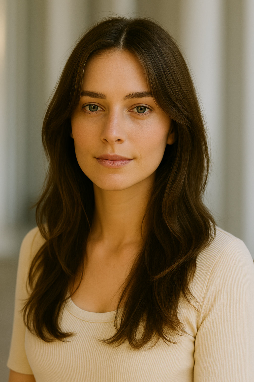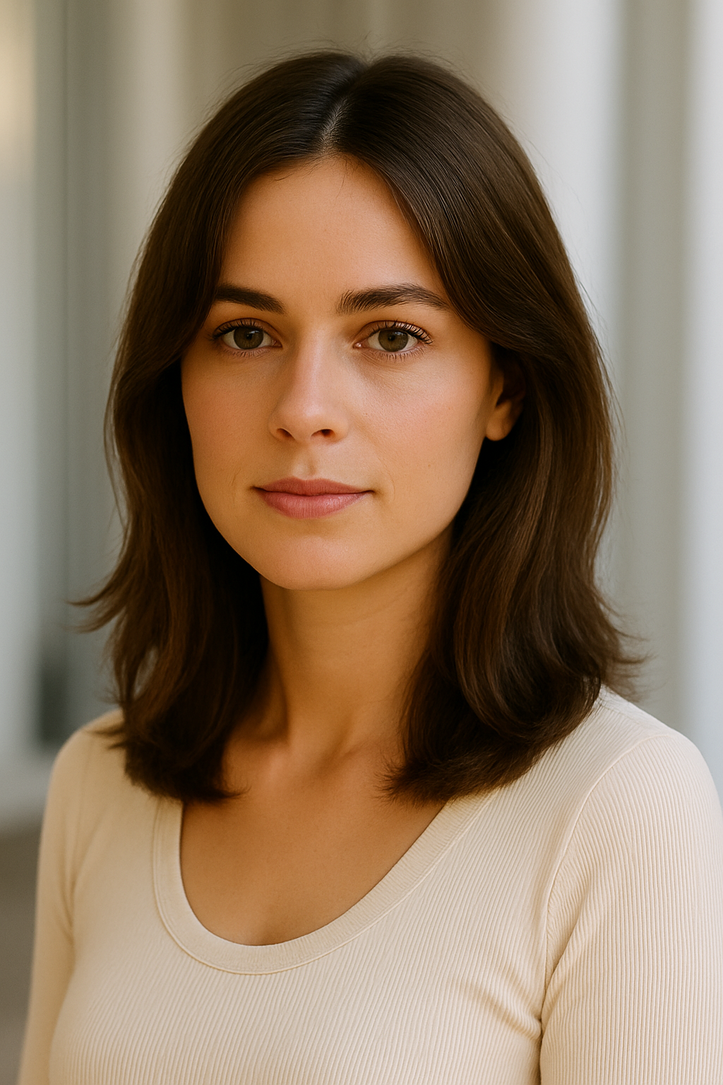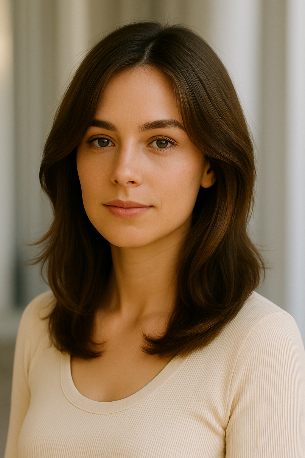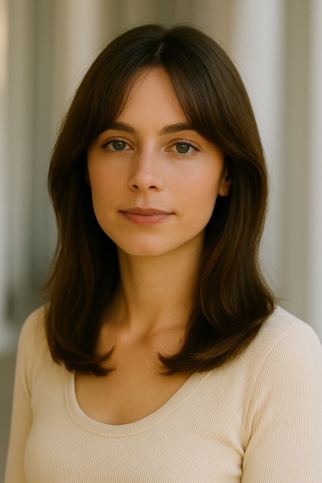 Curtain bangs part down the middle, creating a soft frame that draws eyes toward your face without heavy commitment.