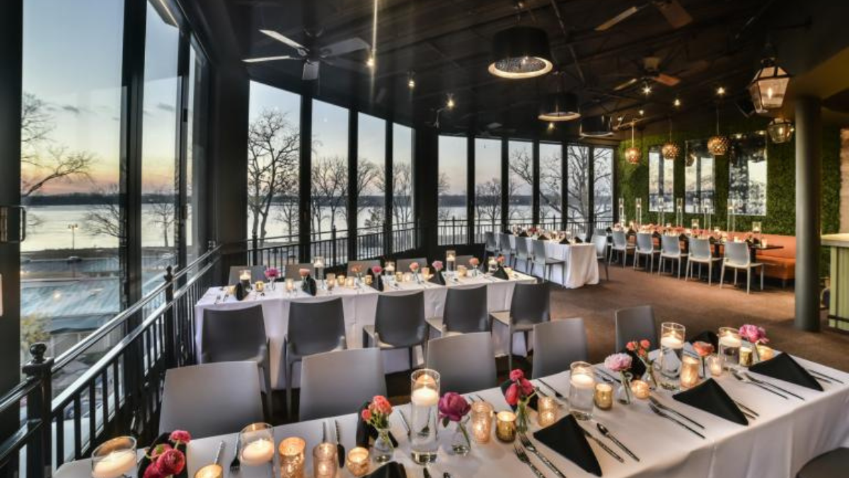 Floor-to-ceiling windows provide stunning lake views from every table inside. The outdoor terrace offers al fresco dining with gentle breezes and beautiful sunset views.