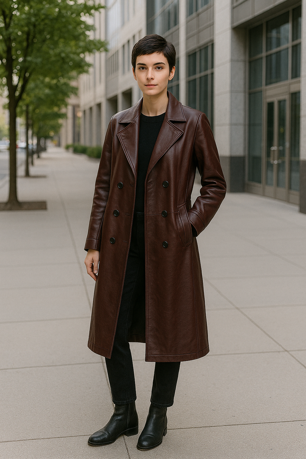 Modern leather coats come in various lengths and styles, from cropped moto jackets to flowing trench styles.