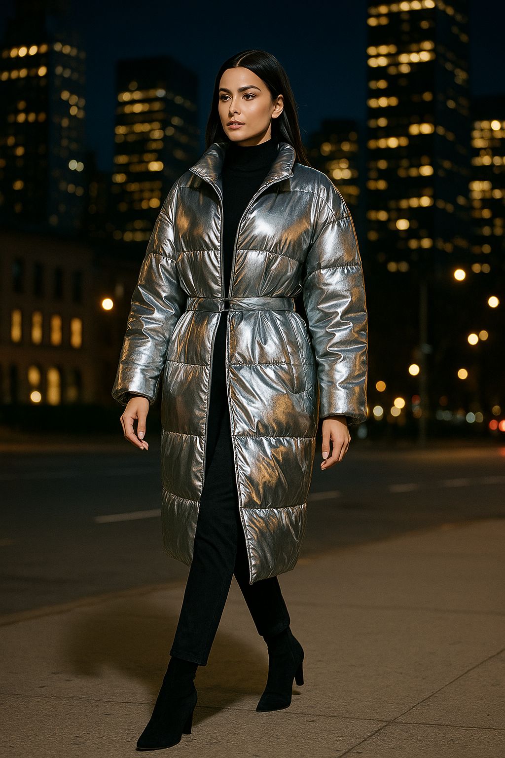 Metallic and high-shine finishes bring futuristic energy to winter dressing, making you look like you’ve stepped off a fashion runway.