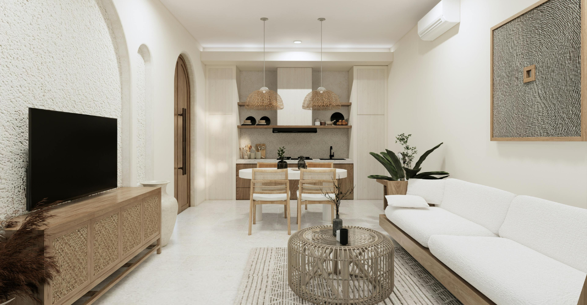 Wood beams paired with stone countertops and rattan chairs create an organic harmony that instantly warms any space. Natural materials bring the outdoors inside, connecting us to nature even when we’re cozy at home.