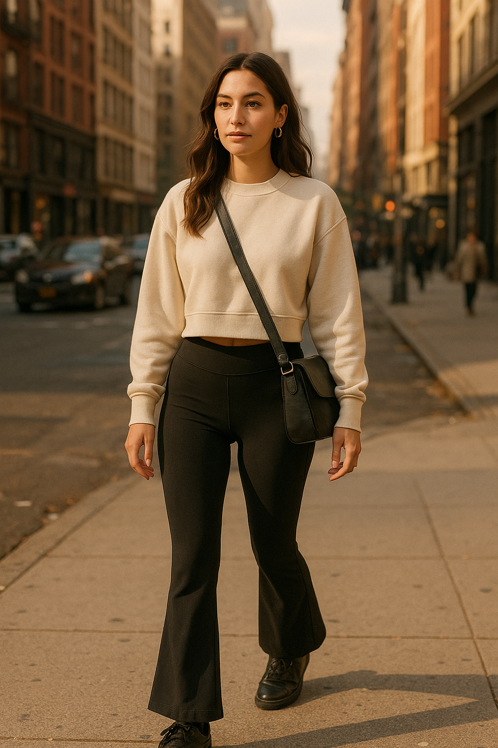 1. Black Flare Leggings + Cream Cropped Sweatshirt + Black Leather Sneakers