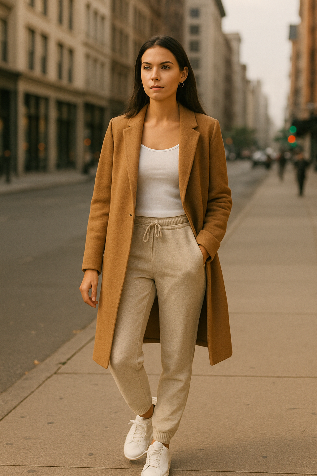 2. Oatmeal Joggers + White Tank + Camel Coat + White Sneakers