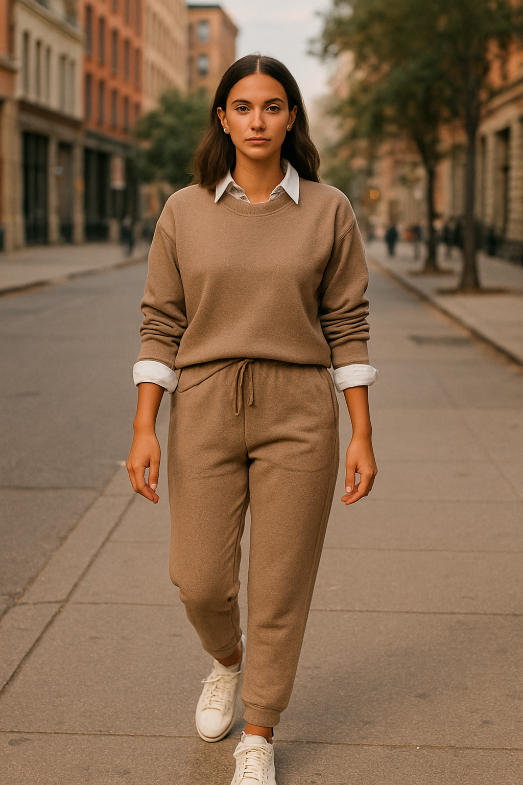 3. Taupe Matching Set + White Button-Up + Minimal Sneakers