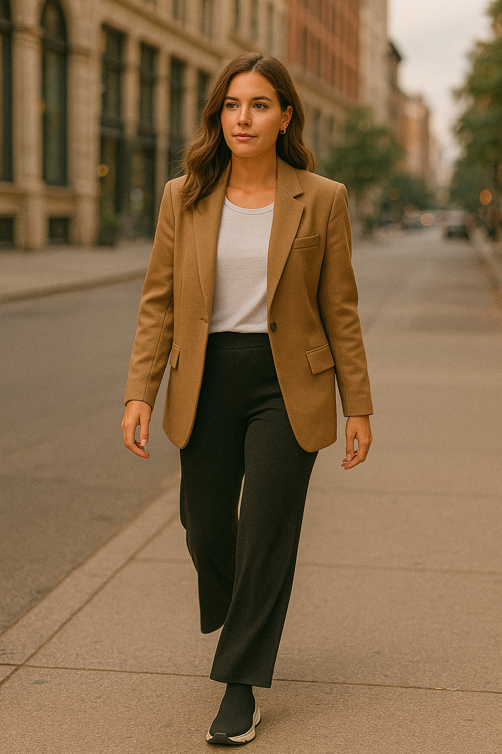 5. Wide-Leg Yoga Pants + White Tee + Oversized Blazer + Sock Sneakers