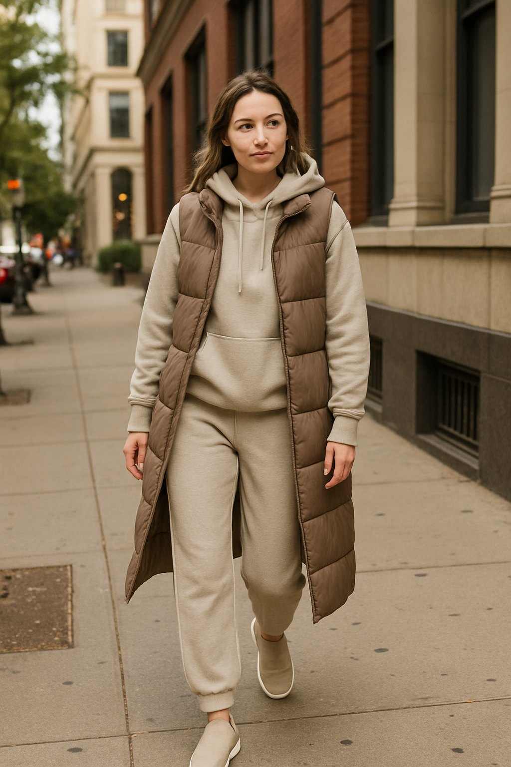 6. Neutral Matching Sweatsuit + Longline Puffer Vest + Slip-On Sneakers