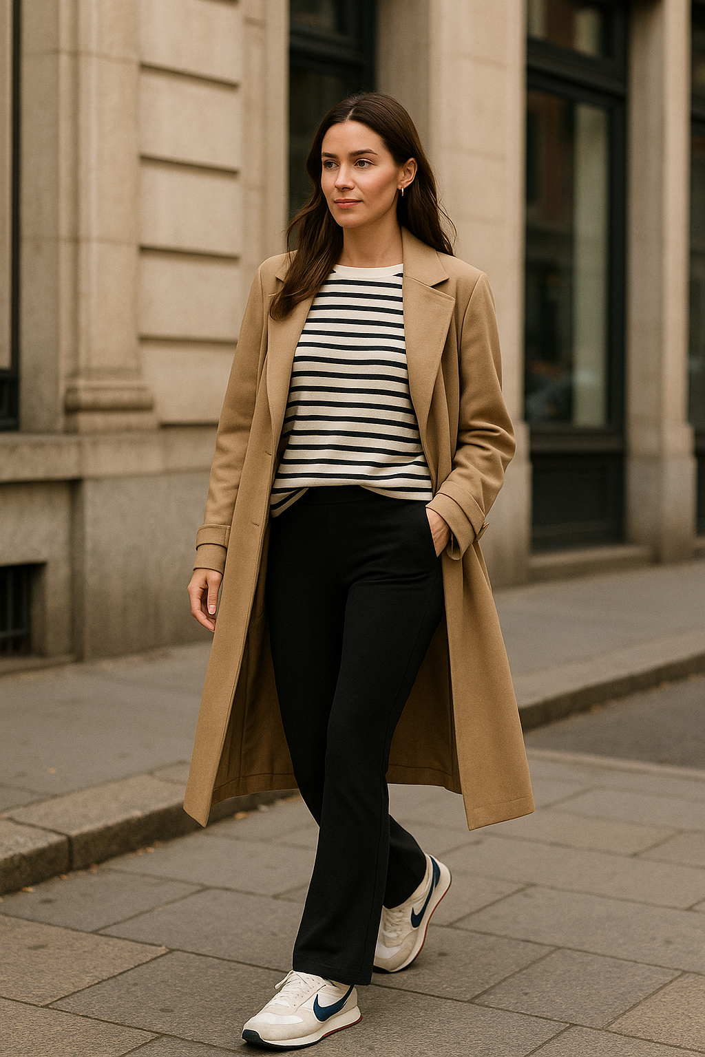 8. Black Leggings + Breton Stripe Top + Trench Coat + Retro Sneakers