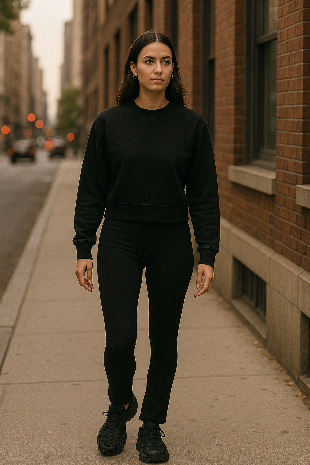 An all-black athleisure ensemble creates a sleek, streamlined silhouette that’s inherently sophisticated and mysteriously cool.