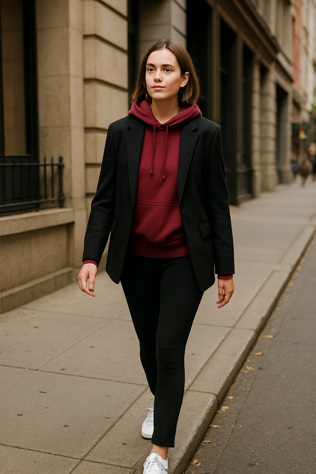 11. Color Hoodie + Black Leggings + Structured Blazer + Clean Sneakers