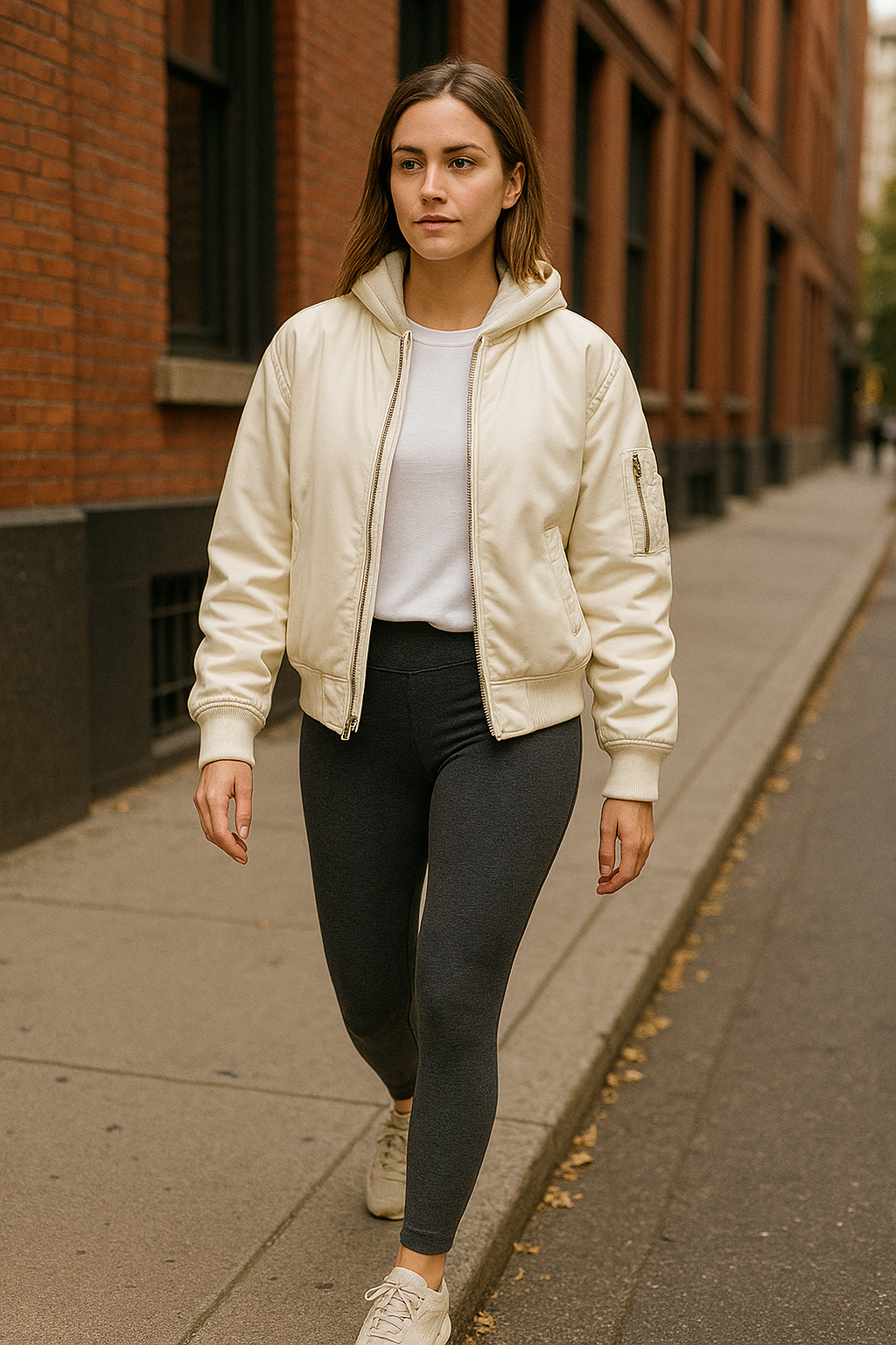 12. Charcoal Leggings + White Tee or Sports Bra + Cream Bomber Jacket + Neutral Trainers