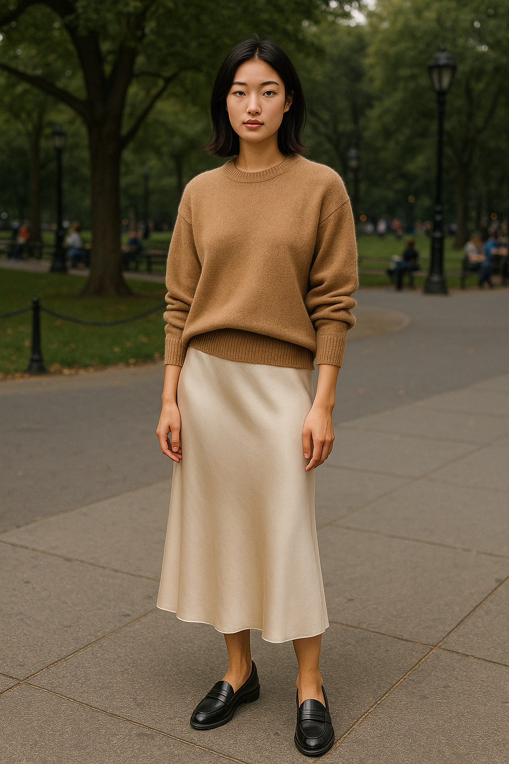 3. Men’s Cashmere Sweater + Slip Skirt + Loafers