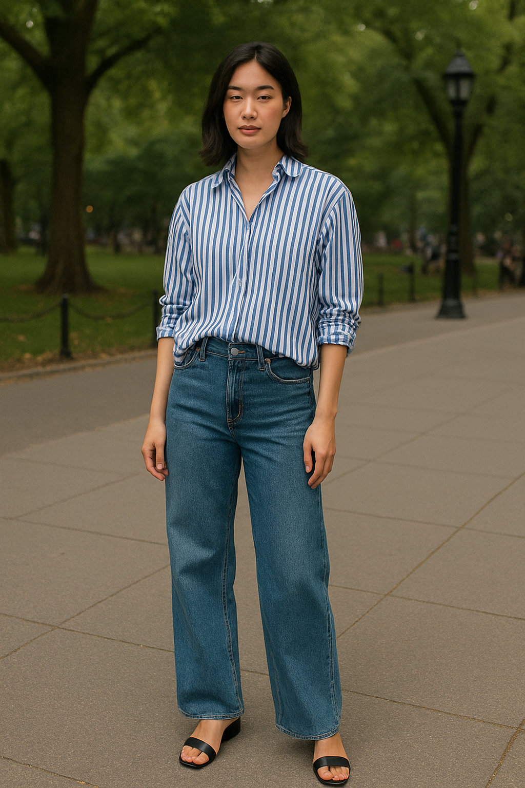 4. Men’s Button-Down (Striped) + Wide-Leg Jeans + Heeled Sandals