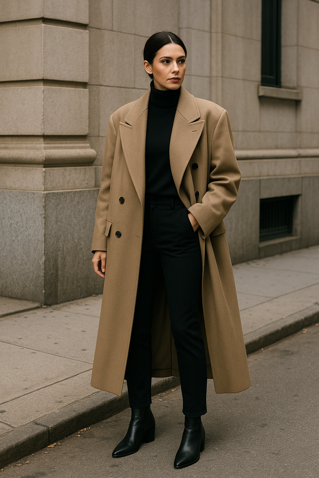 Build your base with all-black pieces—think fitted turtleneck and slim pants or leggings—to keep the focus on the coat’s bold silhouette.