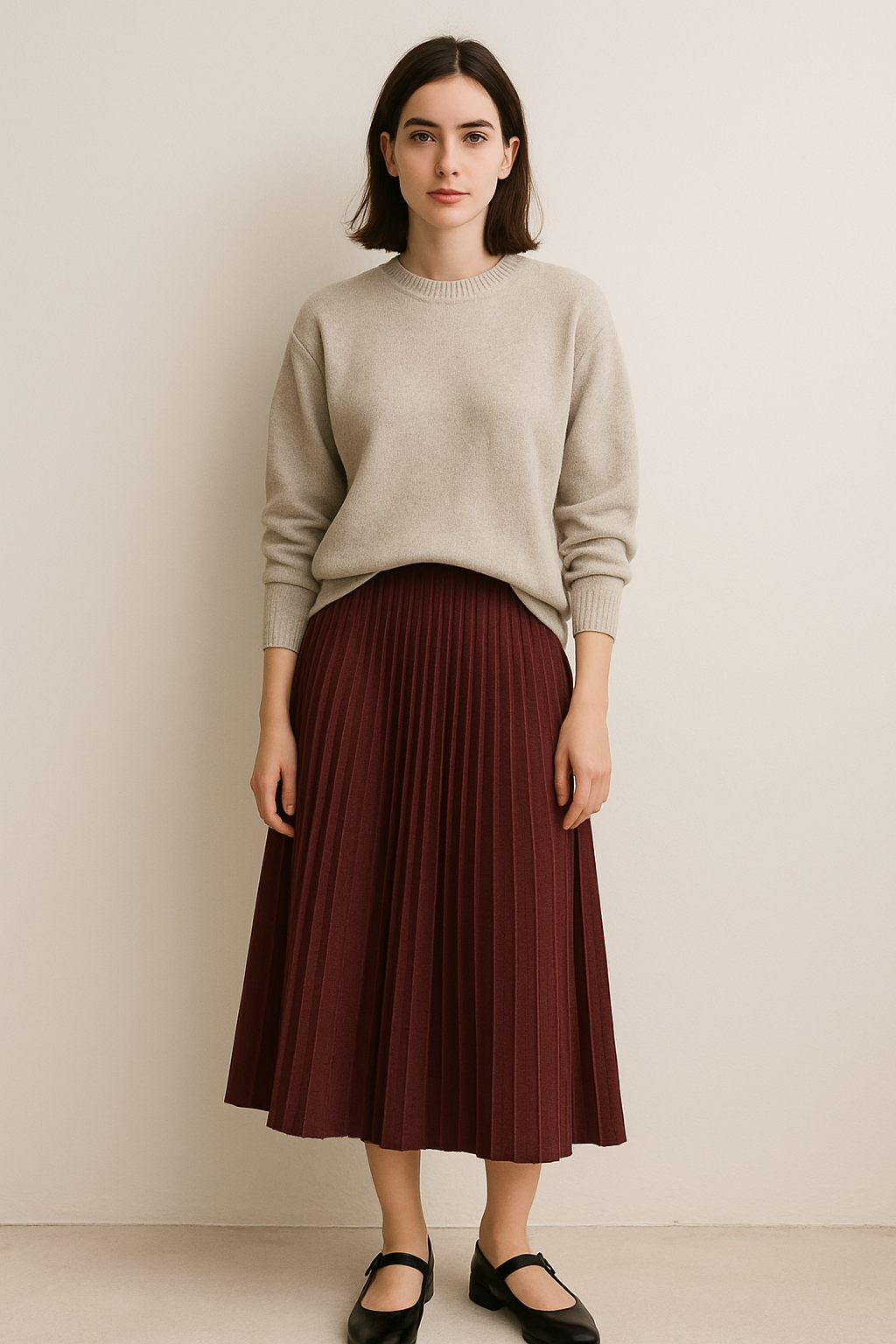 Choose a sweater in a soft neutral and let it contrast with a pleated skirt in a richer tone like burgundy, forest green, or navy.