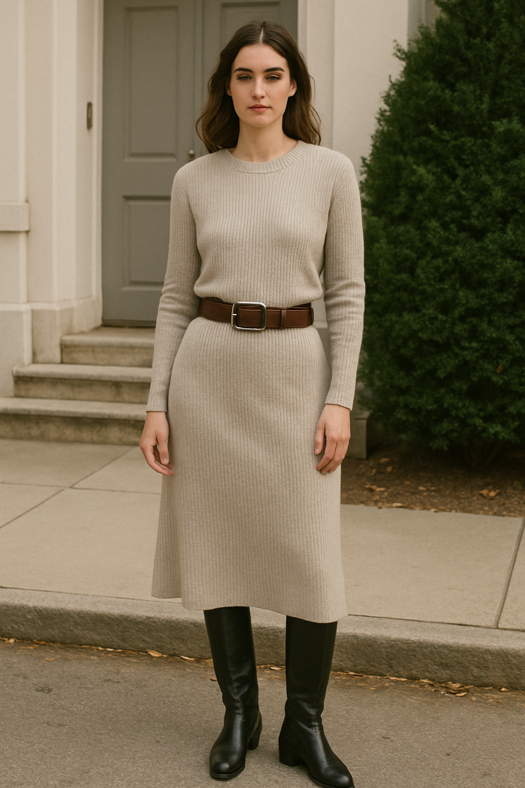 8. Men’s Leather Belt + Slim Knit Dress + Knee-High Boots