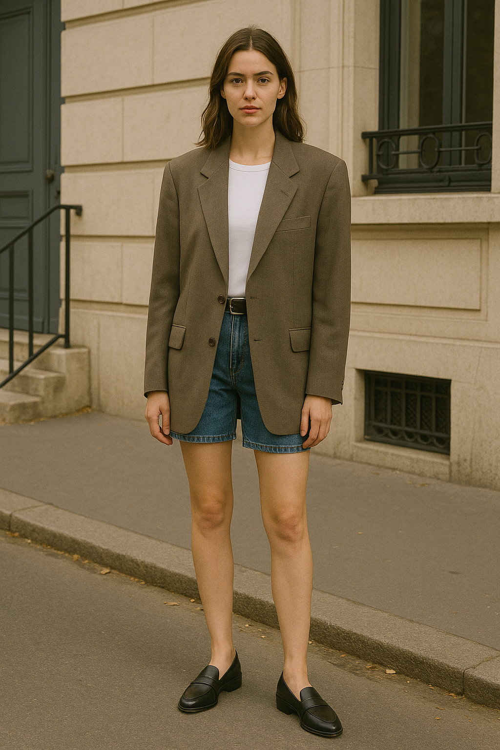 An oversized men’s blazer adds instant credibility to casual denim shorts, elevating them beyond basic weekend wear.