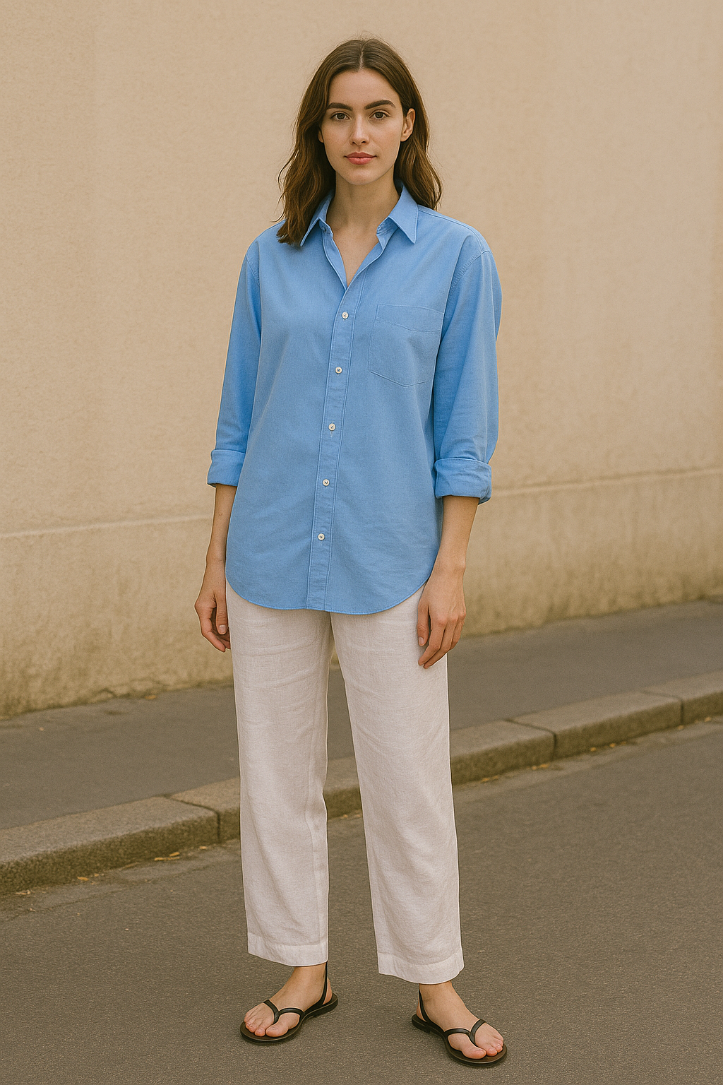 White linen pants complement the shirt’s relaxed elegance while keeping you cool in warm weather.