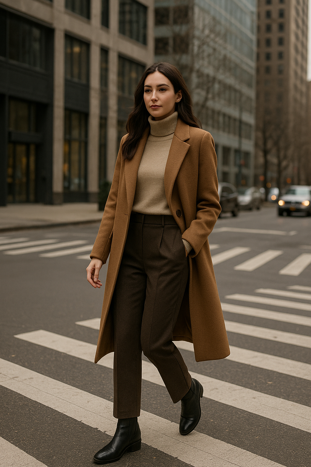 1. Wool Coat + Cashmere Turtleneck + Tailored Trousers + Leather Boots