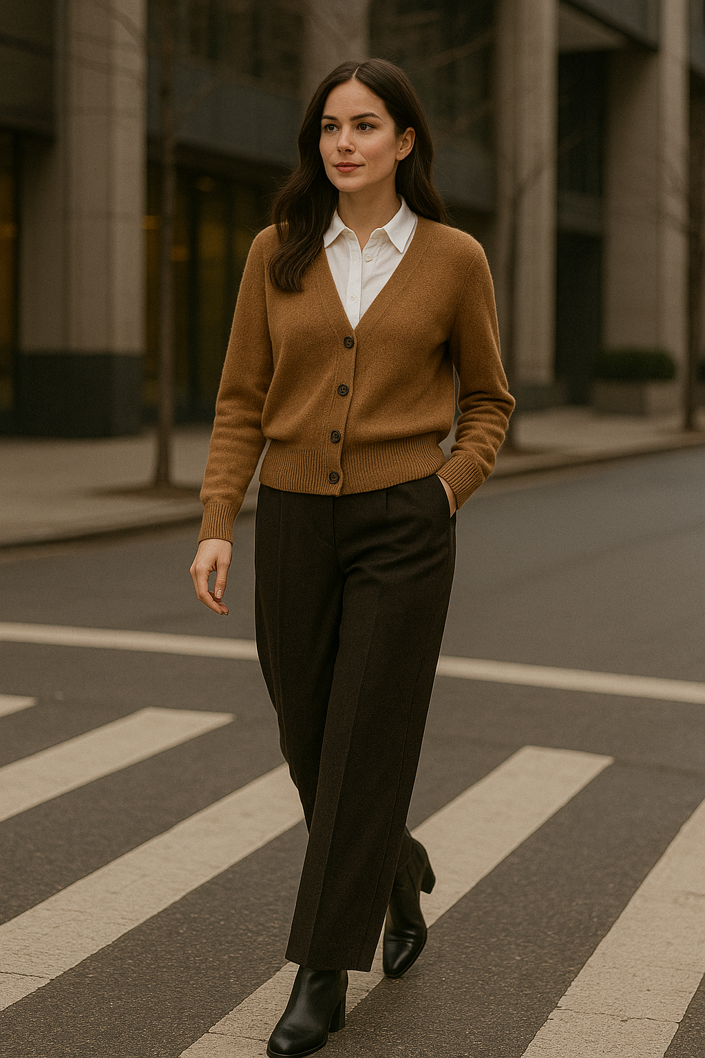 3. Layered Blouse + Merino Wool Cardigan + Wide-Leg Pants + Heeled Ankle Boots