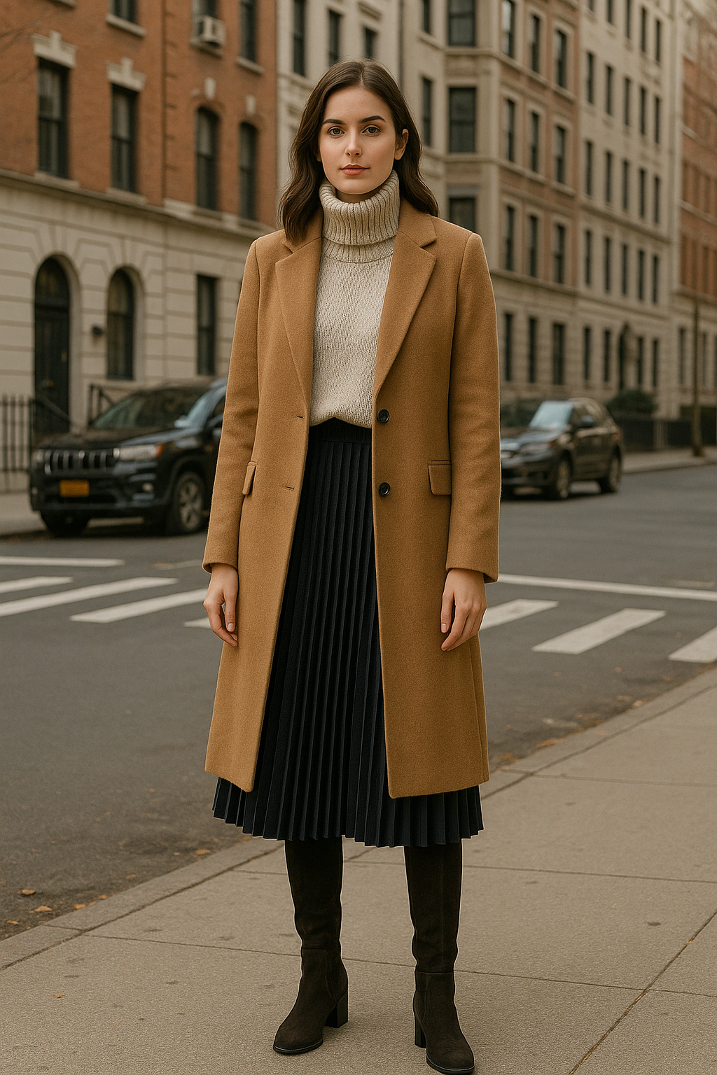 6. Oversized Turtleneck + Pleated Midi Skirt + Knee-High Boots + Longline Coat